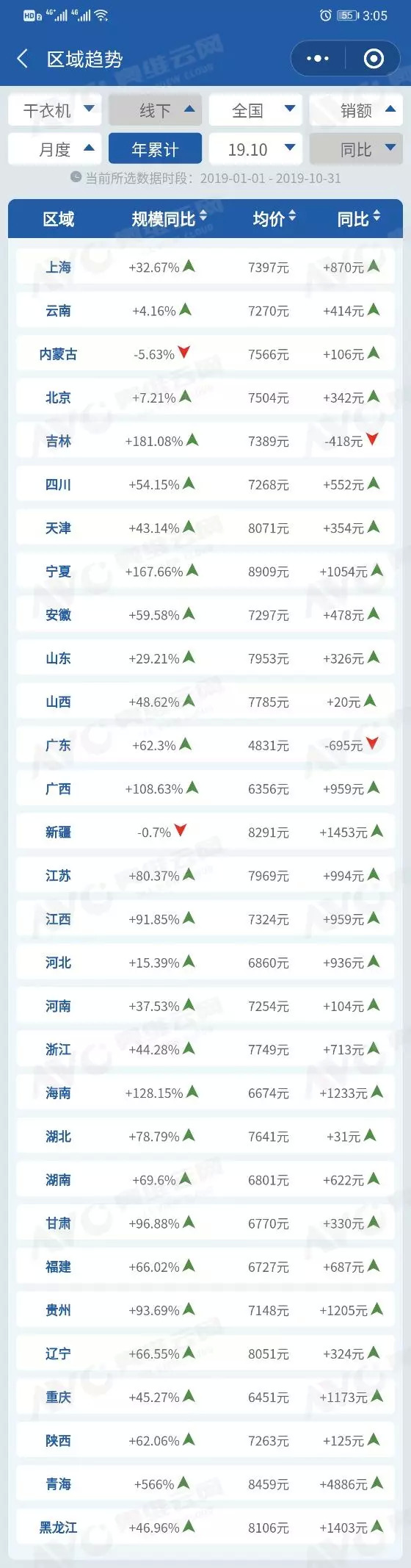 其次,我国各个区域、各级市场干衣机产品的潜在需求都很旺盛,尤其是东部沿海、长江流域及西南地区经常出现阴雨天气,存在大量未释放的刚性需求。奥维掌上罗盘小程序的监测数据显示,2019年1-10月,我国各级市场规模同比都呈现出明显的增长态势,尤其是二三级市场的增幅都超过了六成。从区域表现来看,除了内蒙古和新疆,其他各大省份市场规模同比都呈现出明显的增长态势,个别省份的同比增幅甚至超过了一倍。