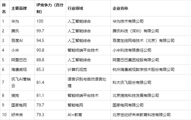 《2019中国人工智能企业知识产权竞争力百强榜》从企业的综合强度、创新能力和技术成熟度三个维度进行定量评比,对500余家中国人工智能主流企业进行定量评估,评选出2019人工智能知识产权竞争力百强企业。其中,十强企业分别是:华为、腾讯、百度、小米、阿里巴巴、海康威视、科大讯飞、搜狗、国家电网和好未来。