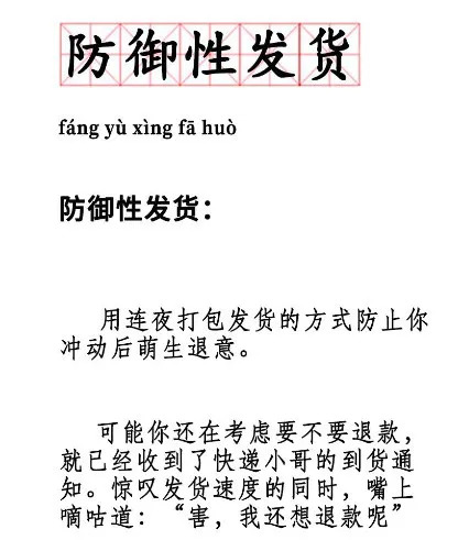 由于到货速度实在太快,网友调侃称这是“防御性发货”,指自己冲动付款完本来还在琢磨着要不要退款,结果一觉醒来东西直接送到家,让人都不好意思退了。