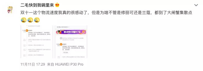 “双十一物流也太快了,我凌晨付的尾款,早上就收到货了。”