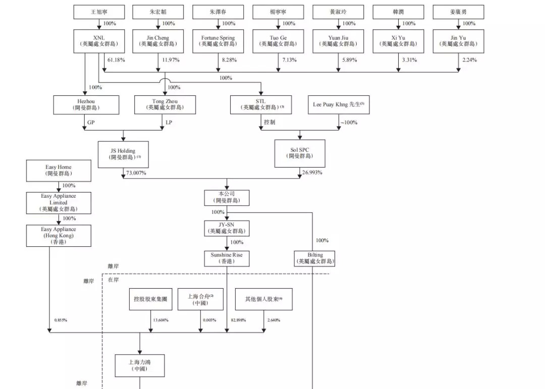 根据港交所JS环球生活的全球发售公告显示目前九阳股份大股东依旧是上海力鸿,而上海力鸿的大股东是一家叫sunshine rise的公司,持有上海力鸿82.89%股权;sunshine rise大股东叫JY—SN,JY—SN的大股东才是要上市的JS环球生活,再向上还有三层架构才是公司实控人王旭宁等。