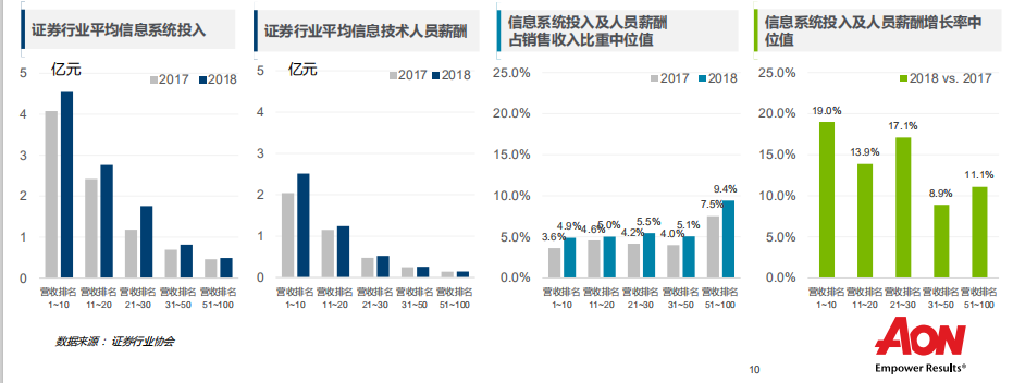 以证券行业为例,报告中引用了证券行业协会的数据发现,2018年所有证券公司的信息系统投入都在增长,增速约为10%,营收排名前30名的公司在15%到20%左右,增长速度更快。但对中小券商而言,这样的行业增速对其压力很大,科技投入已经占营收比重达到10%的水平,这意味着资源越来越少,投入越难。