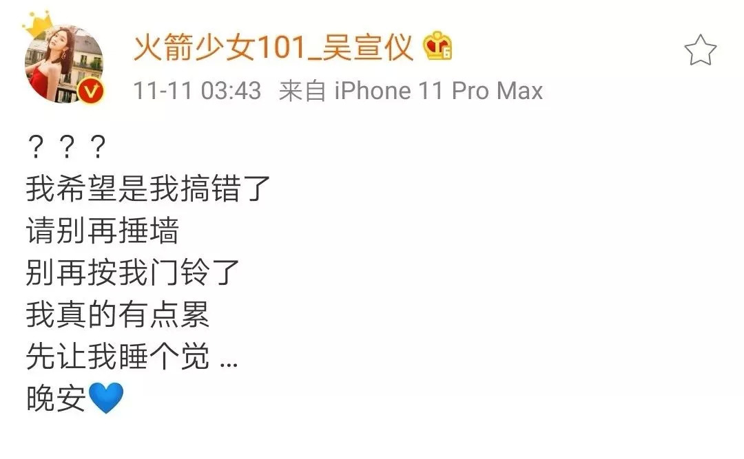 就在这两天,吴宣仪半夜发文,称被私生饭锤墙按门铃,骚扰到无法入睡。