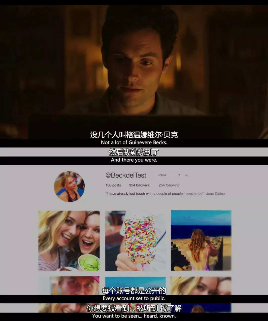 我们可以从《你》中看到,除了刻板印象里的“为心爱的人不择手段”以外,钟情妄想还和更复杂的社会阶层、性别意识、约会文化还有情感教育相关,当然更恐怖的是,我们当下生活在一个隐私更难保护的时代。
