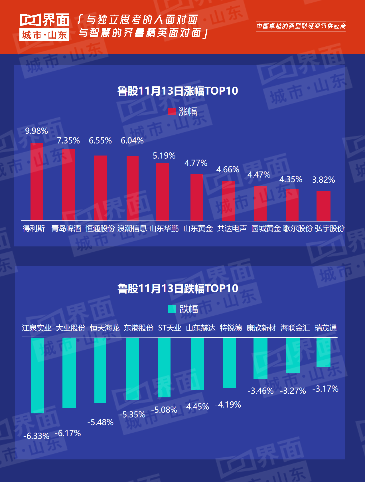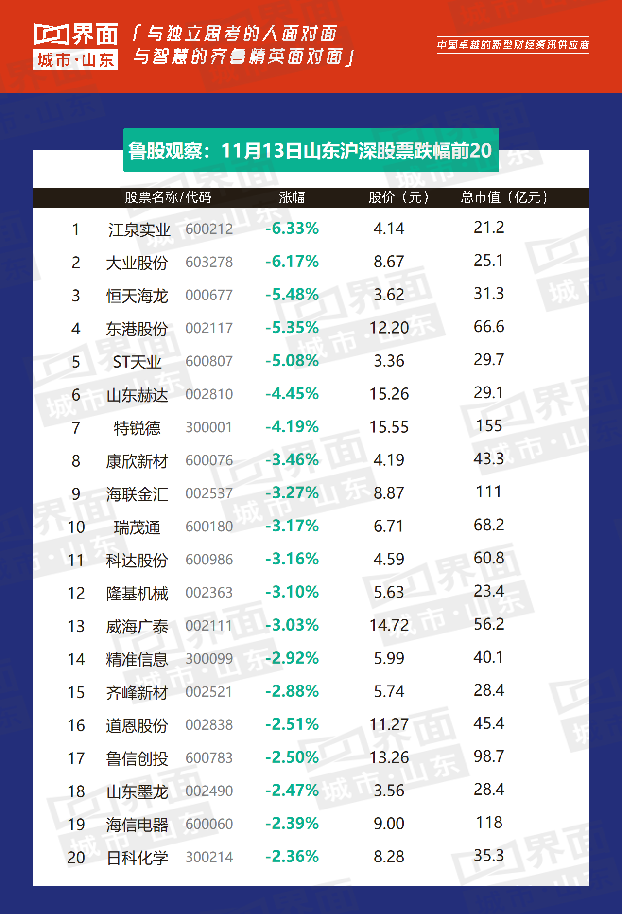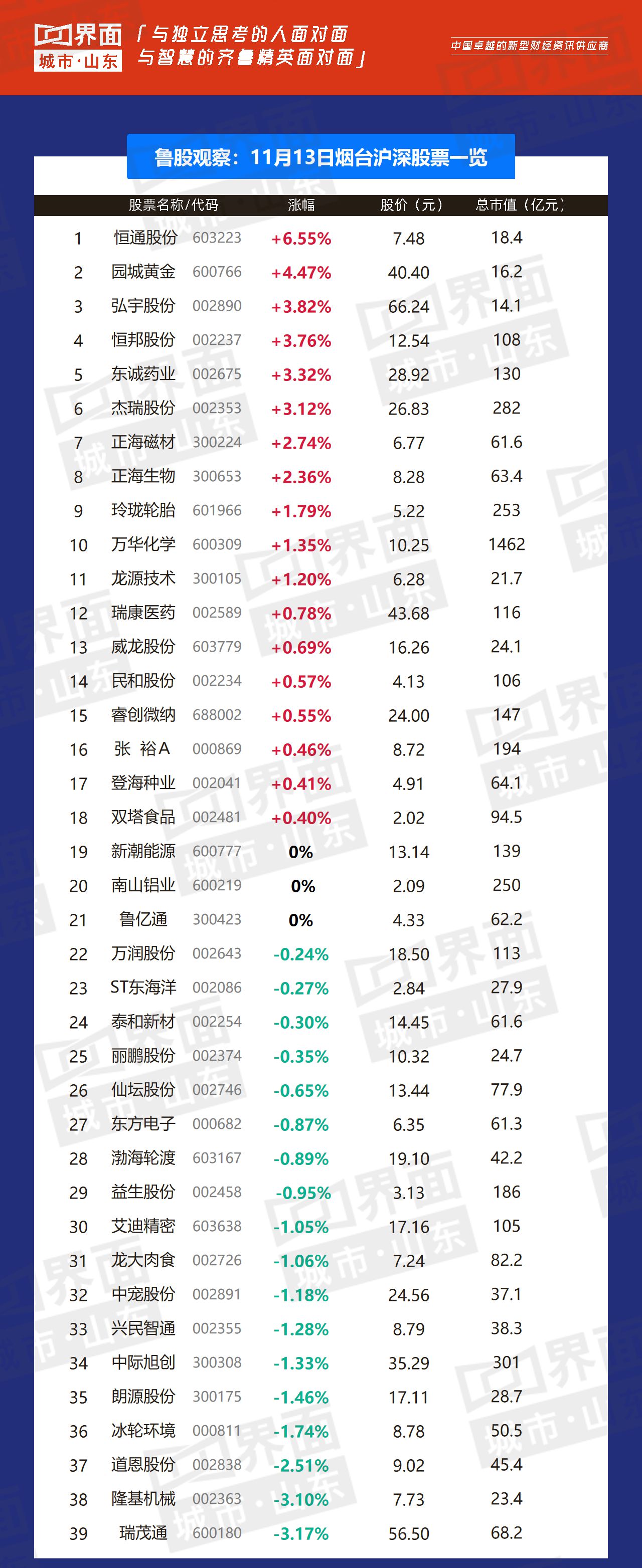 11月13日,山东省内沪深股票有75只个股上涨,121只下跌,13只与上一个交易日收盘价持平;