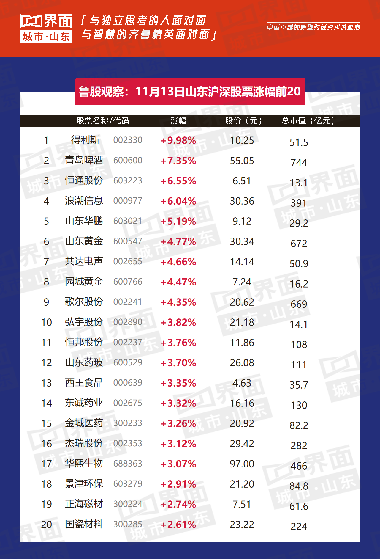 鲁股总结:75只个股上涨,得利斯涨幅居全省首位