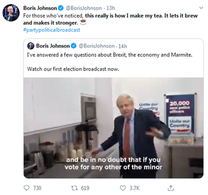 11日,英国首相约翰逊因在一段4分钟的竞选视频中制作了一杯热饮,但他在倒入热水、放入茶包后,直接把牛奶倒了进去。据英国人的泡茶习惯,一般是先放茶包加水,再将茶包取出后加奶和糖。这一做法引发网友的强势围观,一些人甚至开玩笑地质疑,以这样方式泡茶的人是否适合治理国家。约翰逊当天在推特这样回应:“这确实是我泡茶的方式,让茶变得更浓。”
