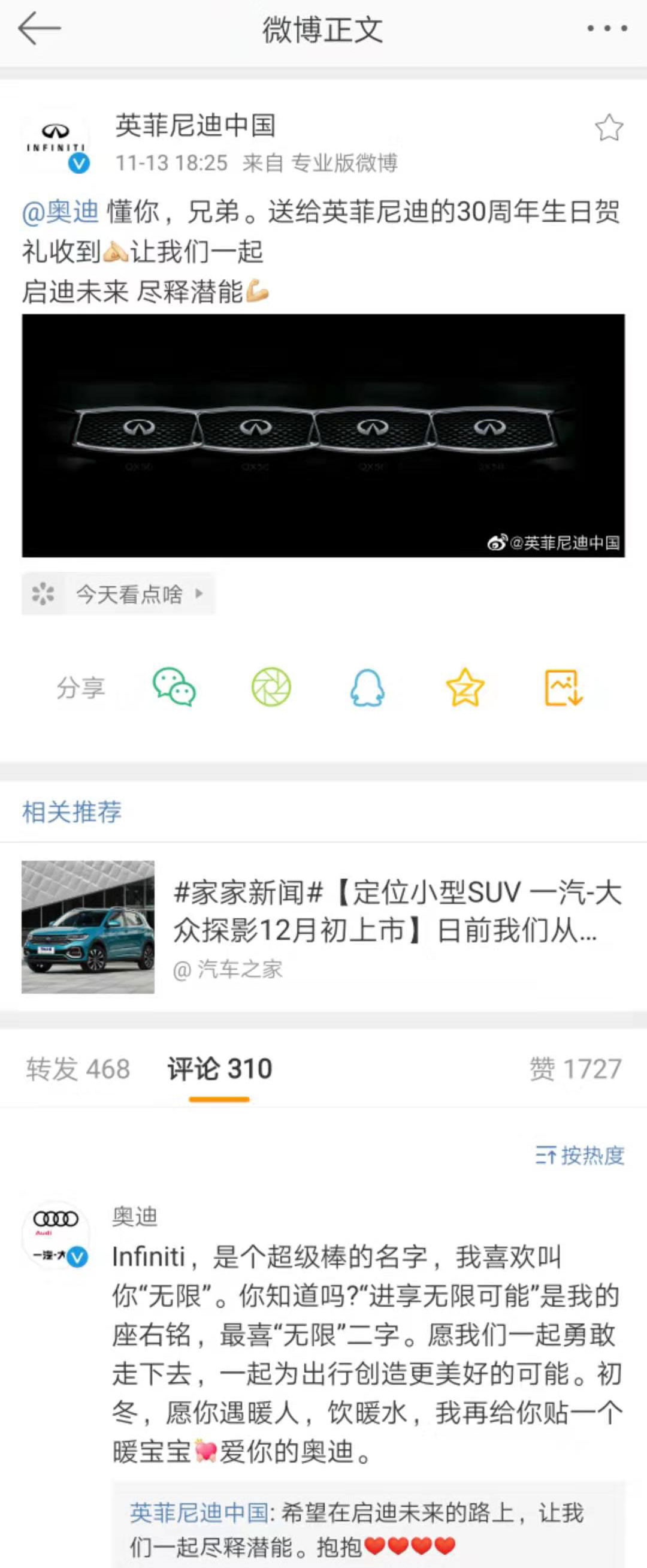 奥迪在英菲尼迪发出的“@奥迪 懂你,兄弟。送给英菲尼迪的30周年生日贺礼,让我们一起 。启迪未来 尽释潜能。”微博内容下方回应称:Infiniti,是个超级棒的名字,我喜欢叫你“无限”。你知道吗?“进享无限可能”是我的座右铭,最喜“无限”二字。愿我们一起勇敢走下去,一起为出行创造更美好的可能。初冬,愿你遇暖人,饮暖水,我再给你贴一个暖宝宝,爱你的奥迪。