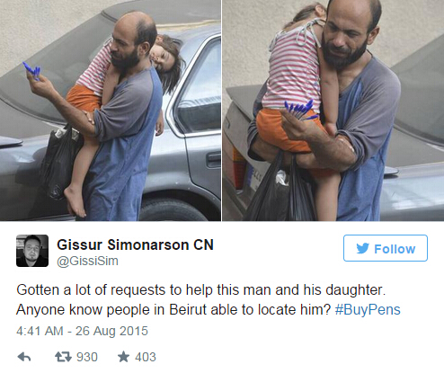 8月25日起,一位叙利亚难民爸爸抱着女儿在黎巴嫩街头卖笔的照片,被超过100万的网友迅速分享。