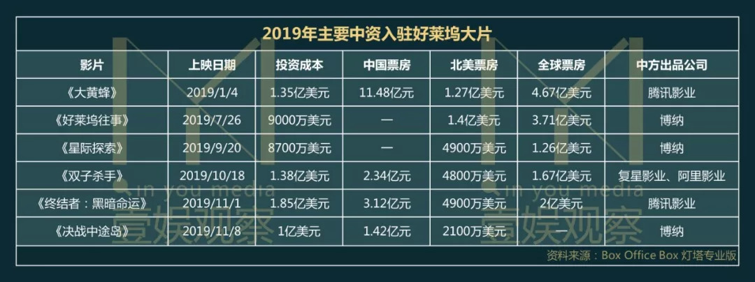 不仅博纳影业,2019年腾讯影业、复星影业、阿里影业对好莱坞大片的投资都显得不太顺,中国资本的好莱坞之旅流年不利。