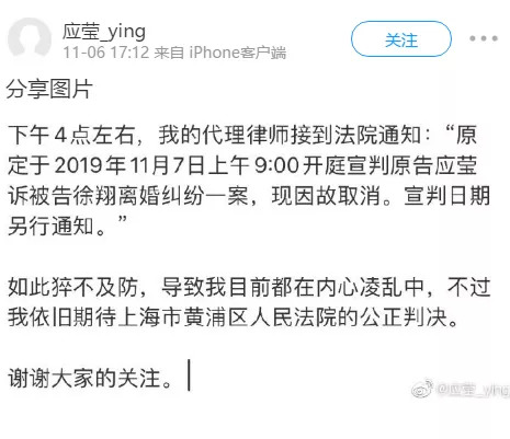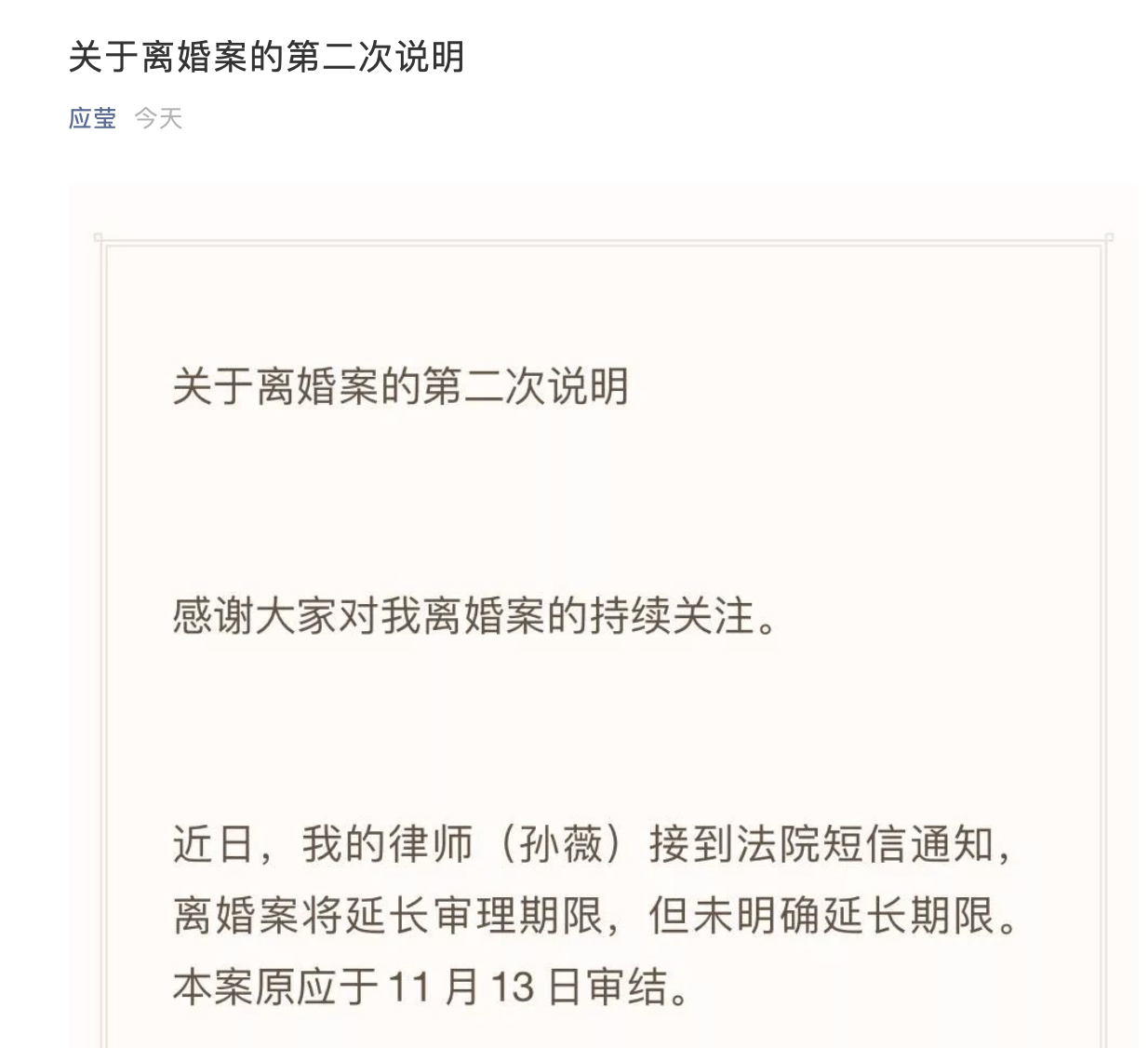 11月6日,应莹再发微博,称接到法院通知,离婚案宣判因故取消,但未明确延长期限。