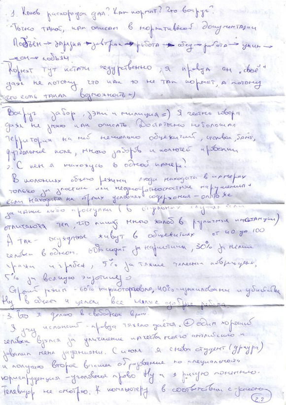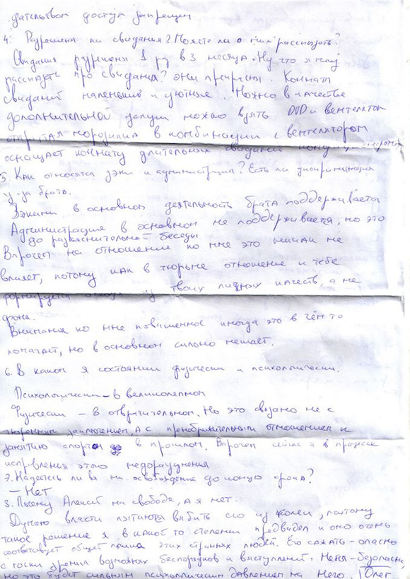 在7月份入狱前,奥列格回答了 Mashable有关他的牢狱生活的问题。监狱要求他的回答都要经过审查,篇幅控制在一张正反面手写的纸以内。他的回答由Mashable翻译并校订。