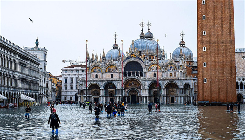 水位最高时,圣马可广场(St Mark's Square)被淹没了1米多,一名长发男子甚至赤裸上身在广场上游起了泳。相邻的圣马可大教堂(St Mark's BaSilicon)在1200年的历史上只被洪水淹没过六次,其中四次发生在2008年以后。
