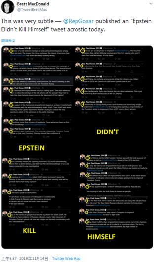 自亿万富翁爱泼斯坦狱中之死被法医裁定为自杀以来,对这一结论的质疑声一直不断。据环球网14日报道,11月13日,国会正举行针对弹劾总统调查的首次听证会,一位共和党议员却以抨击民主党发起弹劾调查为主要内容的23条推文,有人注意到推文其实是一首“藏头诗”。所有推文首字母拼在一起的意思是--“爱泼斯坦不是自杀”(EPSTEIN DIDN’T KILL HIMSELF)。