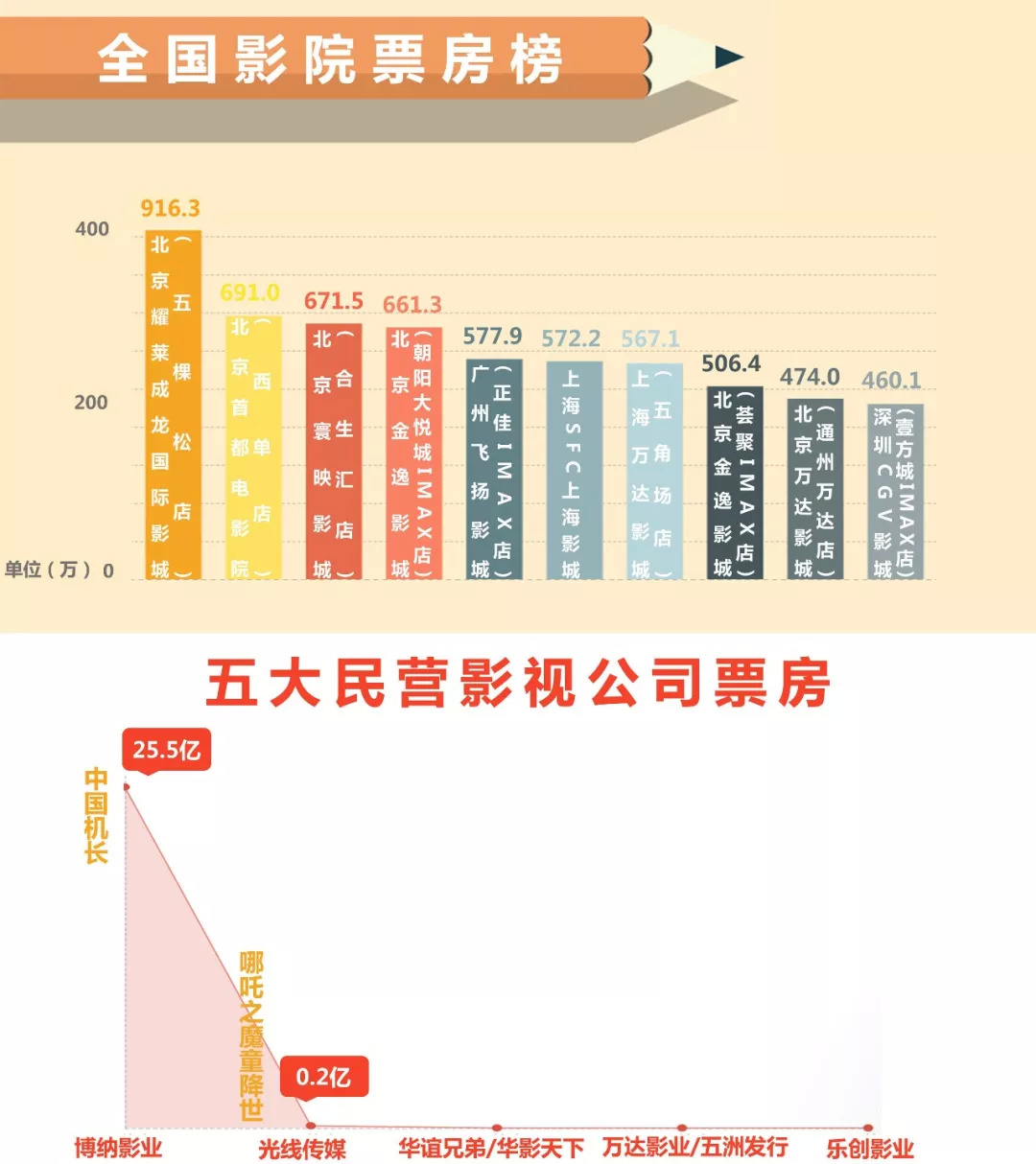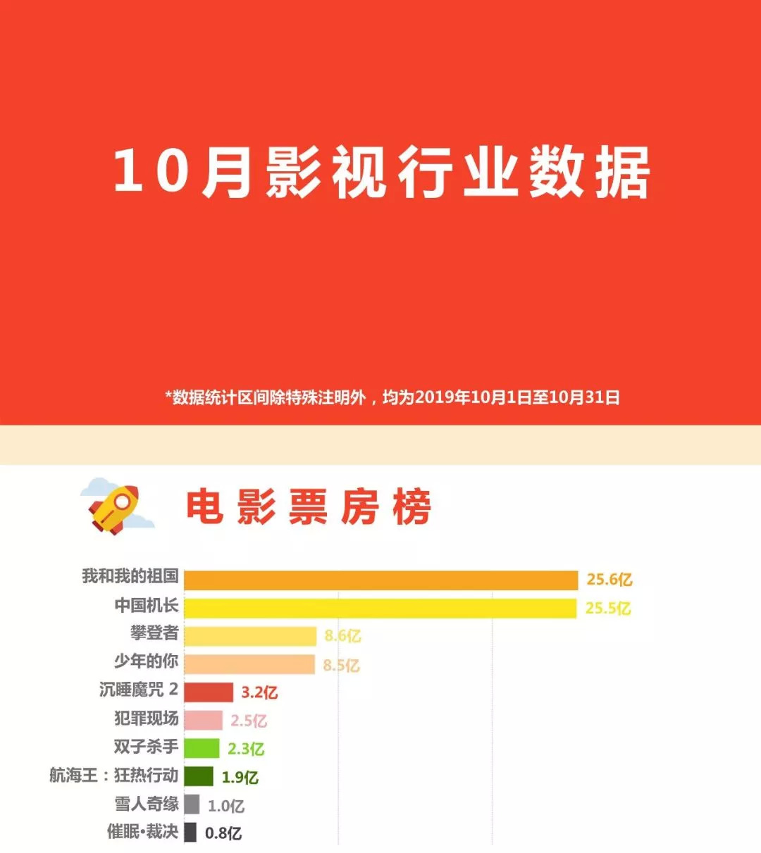 电影10月上映43部新片,总票房81.7亿,第一名《我和我的祖国》票房约25.6亿;五大民营影视企业10月主发行电影票房榜第一名博纳影业,其电影《中国机长》票房约25.5亿;影院票房排行第一名北京耀莱成龙国际影城(五棵松店),票房约916.3万,观影人次约19.5万。