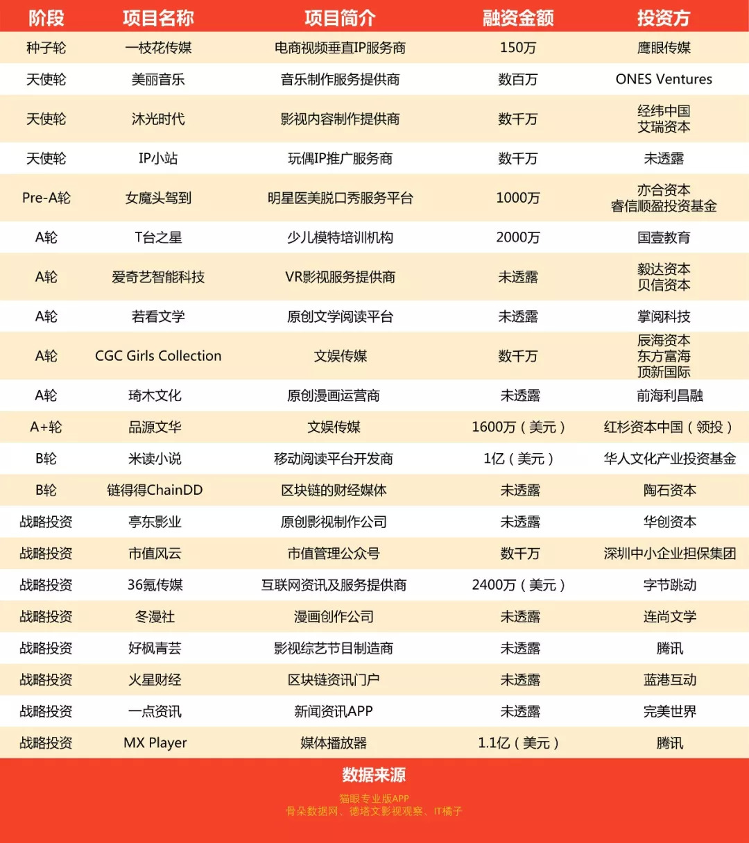 10月文娱行业共有21家公司公布了融资事件,其中,字节跳动投资了36氪传媒,完美世界投资了一点资讯,腾讯投资了MX Player。