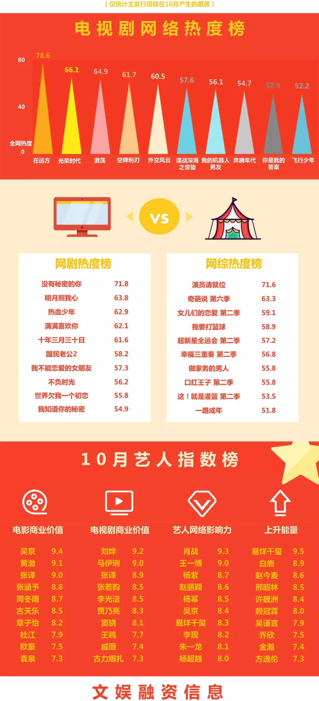 艺人电影商业价值指数第一名为吴京,艺人电视剧商业价值指数第一名为刘烨,网络影响力指数第一名为肖战,上升能量指数第一名为易烊千玺。