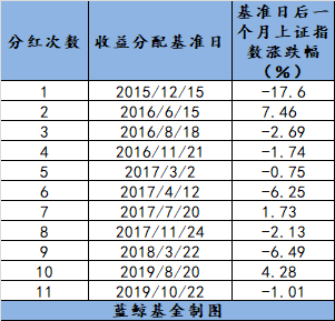 以中欧时代先锋为例,该基金成立以来分红11次,其中8次分红后一个月的市场均出现了不同程度的下跌。而在今年,周应波一改往年将分红放在11月下旬至12月中上旬的习惯,最新一次分红放在了10月末,非常巧合,上证指数自11月初以来也进入了震荡调整期。