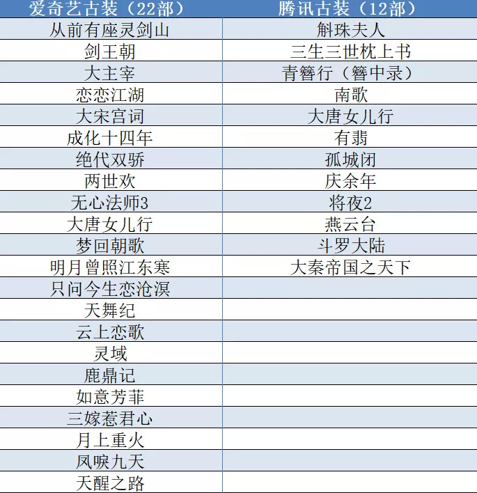 虽然“限古令”的影响还未完全消散,但古装剧以其在年轻观众中的独特存在感,仍旧成为各平台着重发力的部分。爱奇艺以22部古装剧集的储备居首,腾讯则以12部排名第二。