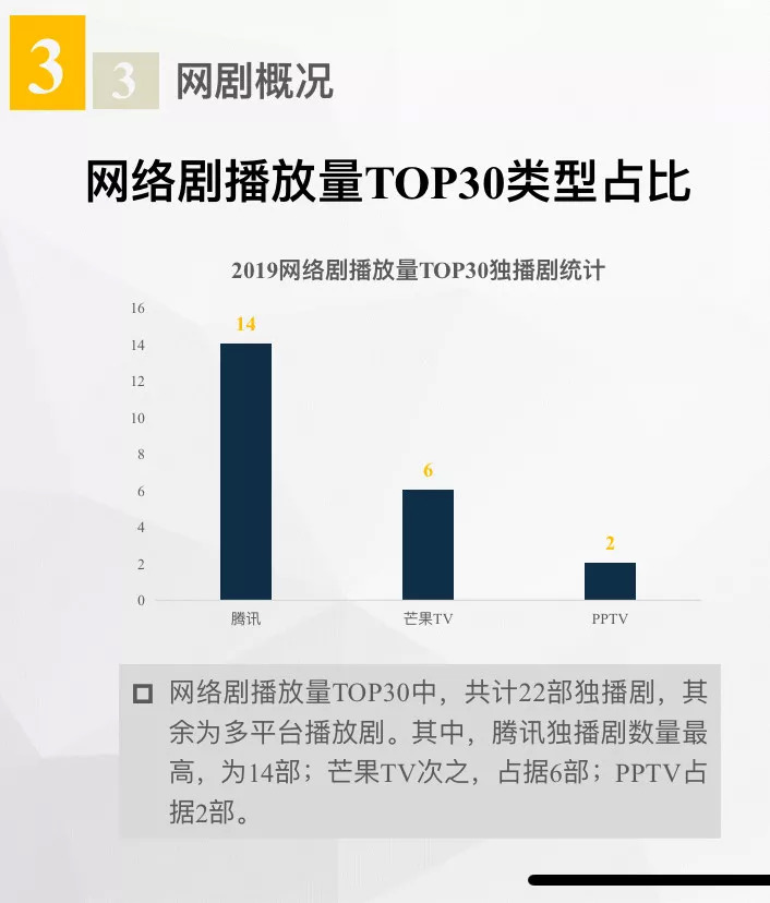 当台网联动成为主流,独播剧和自制剧便成为视频网站巩固用户、体现内容价值的主要途径。近日,秋交会上发布的《中国电视剧风向标2019》显示,截至2019年11月,在网络剧播放量前30名中(爱奇艺、优酷的剧集因未公布前台播放,未计入榜单),有22部是独播剧。