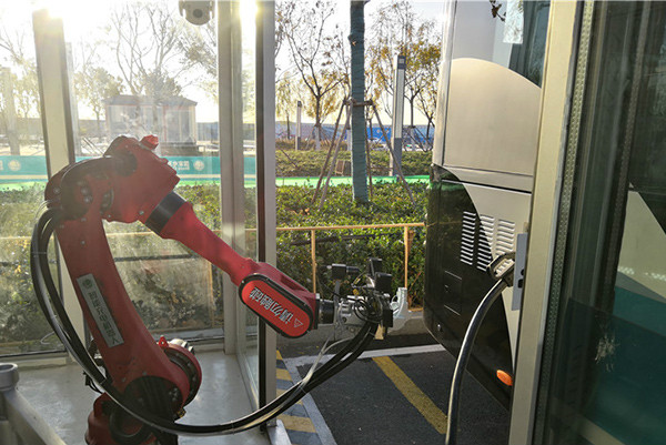 11月7日下午3点,一辆长着“熊猫脸”的公交车缓缓停在中新友好图书馆公交车站旁的停车场上。一只红色的机械手臂轻轻移动,取下充电枪,转身、前进,干净利落地将充电枪插入公交充电口,全过程不到2分钟。