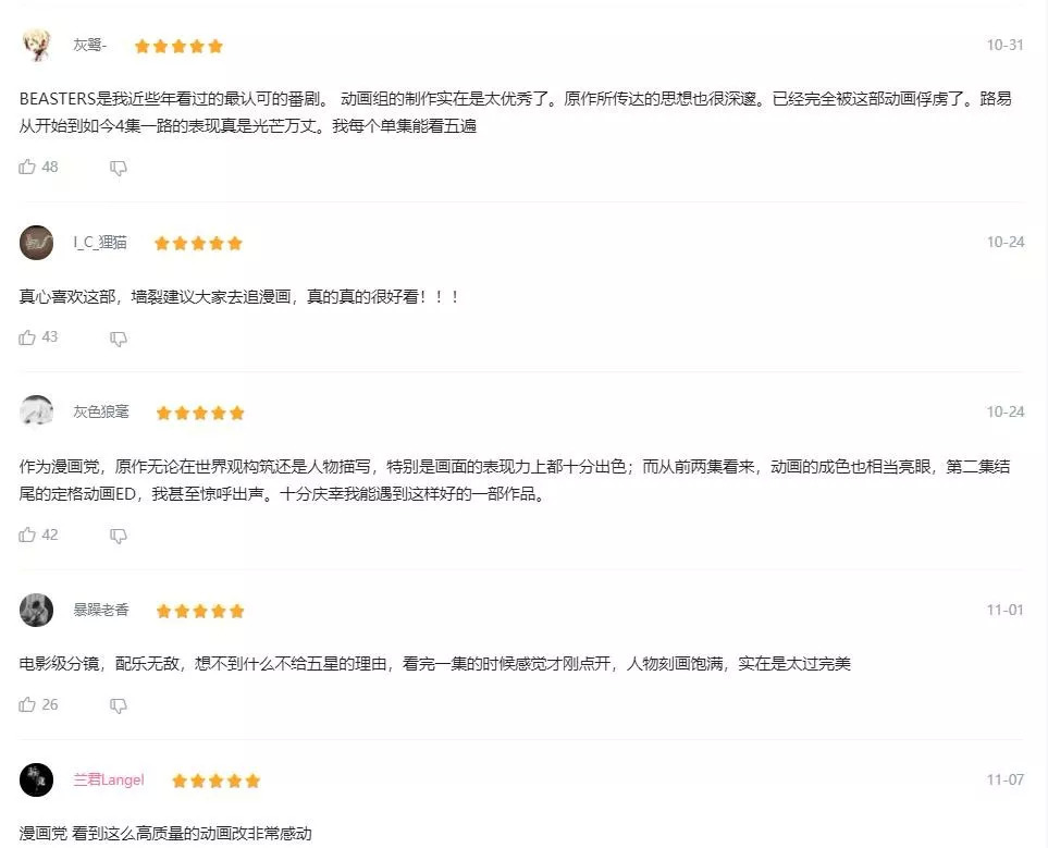 截至11月13日,《动物狂想曲》已播出5集,获得总播放量1773.5万次,集均播放量354.7万次,追番人数184.1万;在35123人评分之下,作品评分9.8分,成为十月新番中评分最高的作品,甚至有不少观众称它为十月番中的“神番预定”。