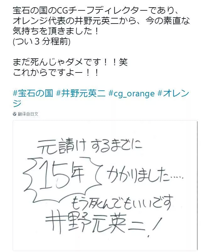 另外,值得一提的是,在《宝石之国》第一话播出时,orange的代表、动画导演井野元英二发出了感叹:成为总承包为止已经花了15年,感觉死了也没什么了。之后又改口表示:现在还不能死,一切才刚刚开始呢。