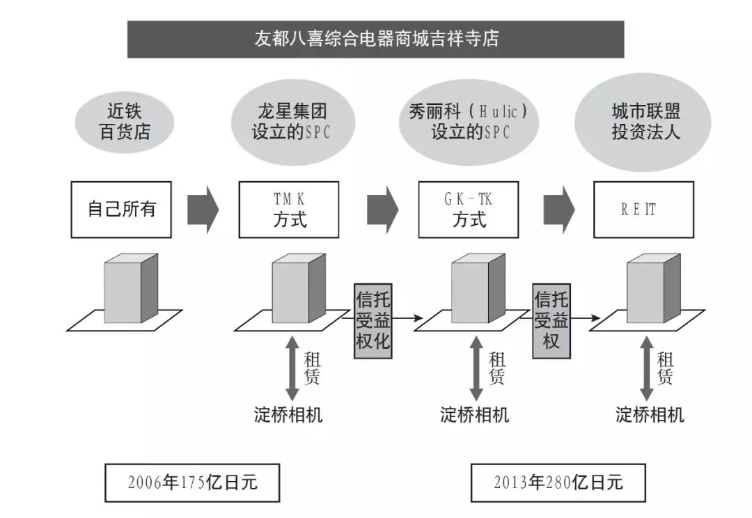 2011年12月,秀丽科将该资产的信托受益权转让给由该公司出资成立的名为“合同公司吉祥寺YCM基金” 的SPC。秀丽科采用的是合同公司+匿名组合的证券化架构,即GK-TK模式。在整体的交易金额288 亿日元当中, SPC通过金融机构的贷款和TK的出资,分别募集了213亿和75亿日元(占26%)。