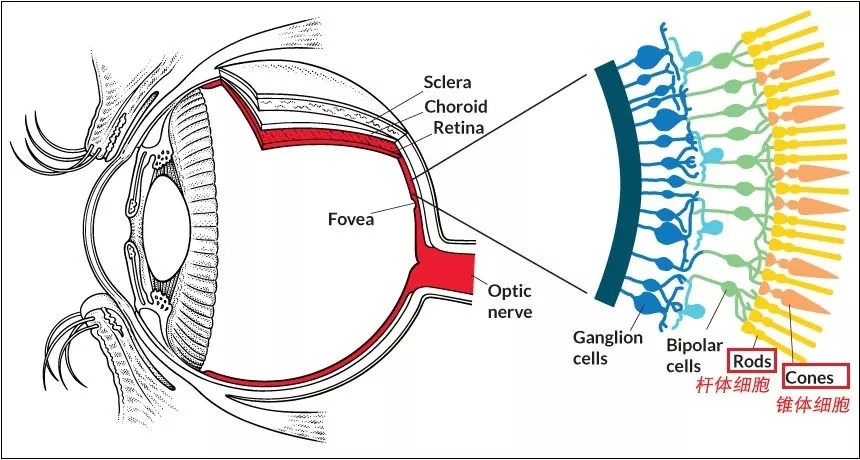 我们的视网膜里有两种很重要的视觉细胞:锥体细胞和杆体细胞。