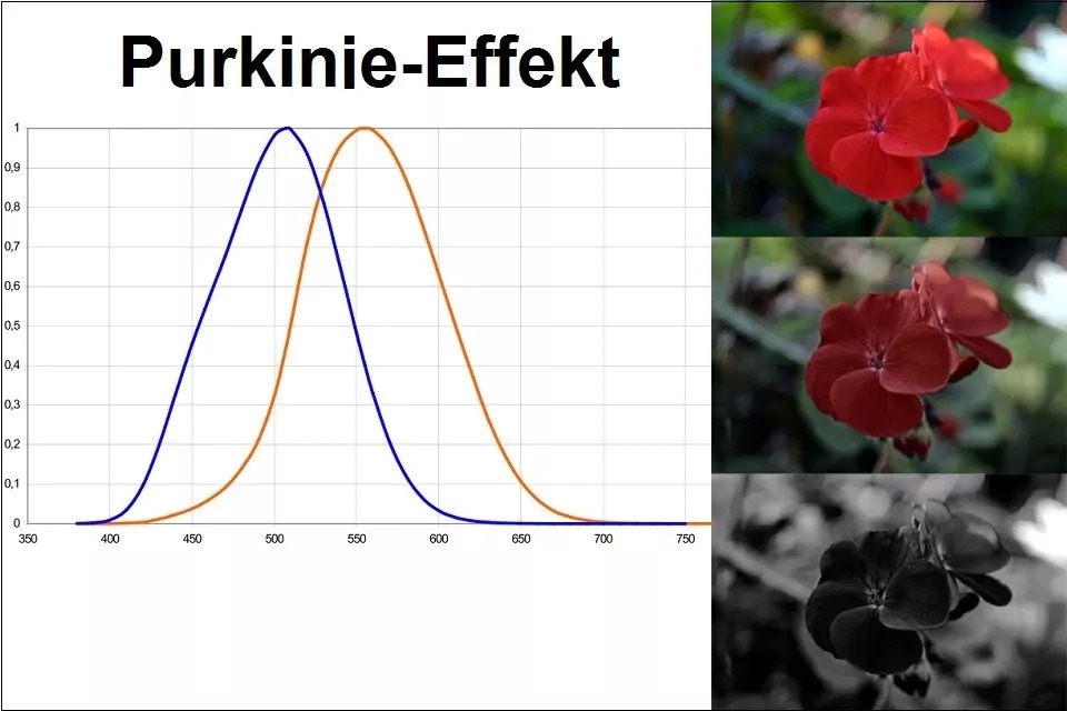 因此,在明亮的环境中,红色和橙色看起来较亮,而在黑暗中,蓝绿色看起来较亮。这也解释了在夜晚时红玫瑰的花瓣颜色变成灰色,而绿叶变得更显眼。