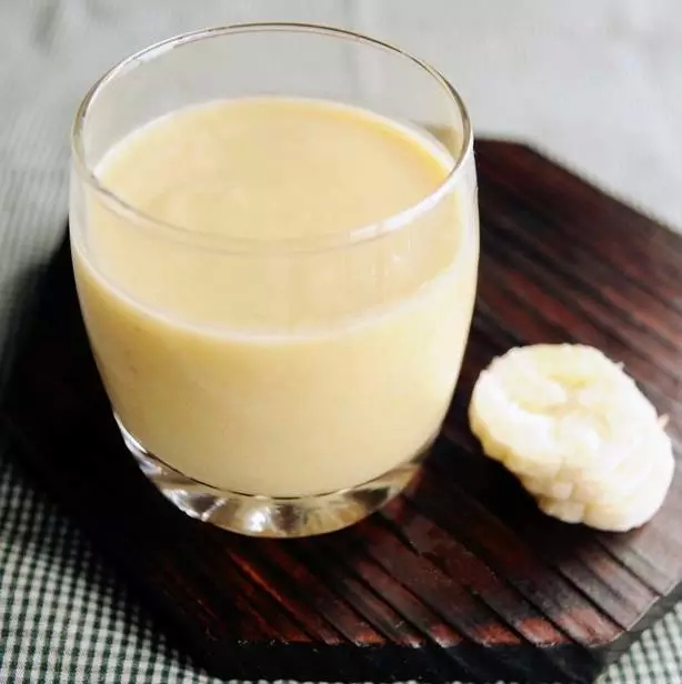 ②去皮的香蕉和切成适当大小的黄桃,连同蜂蜜牛奶,少量淡奶油一起放入搅拌器中搅拌即可。