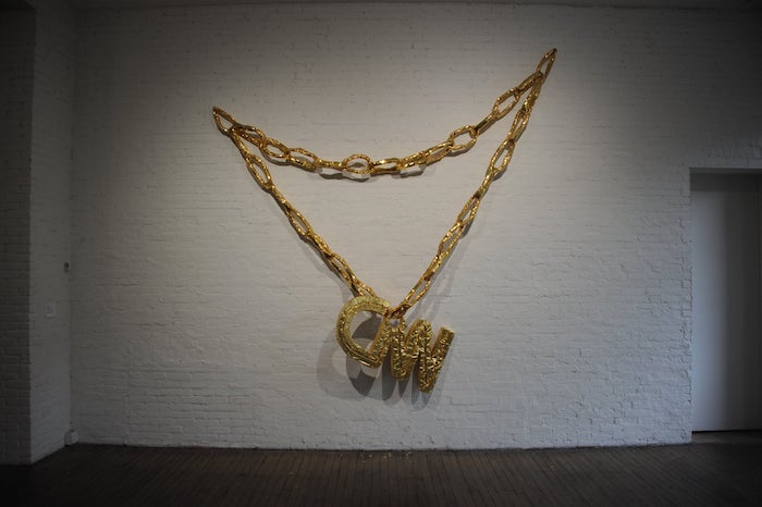 走进皇后区的纽约现代艺术博物馆PS1分馆,跟你打照面的是一面惊人的墙面雕塑——巨型大金链子上串着一枚CNN标志的吊坠。