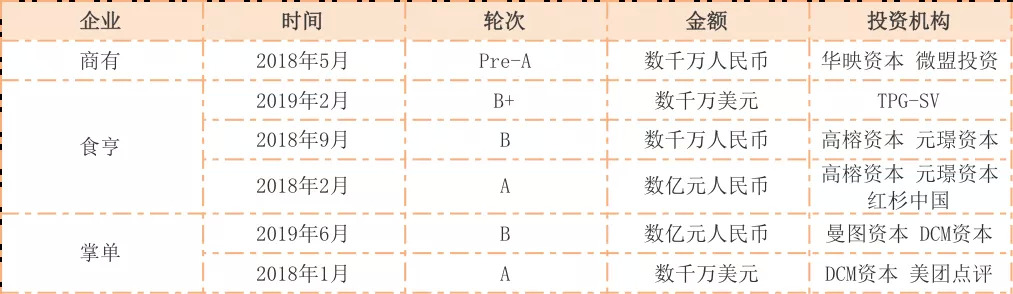 清科私募通数据显示,在2019年2月,“食亨”获得数千万美元B+轮融资,这是该企业2018年以来获得的第三轮融资,其此前的股东不乏红杉、高榕等知名机构;2018年5月,“商有”获华映资本领投、微盟继续跟投的数千万元Pre-A轮融资;2019年6月,“掌单”宣布完成曼图资本、DCM资本数亿元融资。