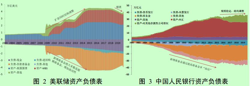 目前,中国人民银行与美联储资产负债表结构存在较大差异。 中国人民银行资产负债表主要反映了央行和银行之间的关系,资产端以外汇储备(在资产负债表上体现为外汇占款形式)和对银行的债权为主,负债端则以对银行的债务和现金为主。同时,中国实施常态货币政策,法定存款准备金率作为常规货币政策工具发挥了重要作用,这导致中国人民银行资产负债表变化的效果与美联储明显不同。
