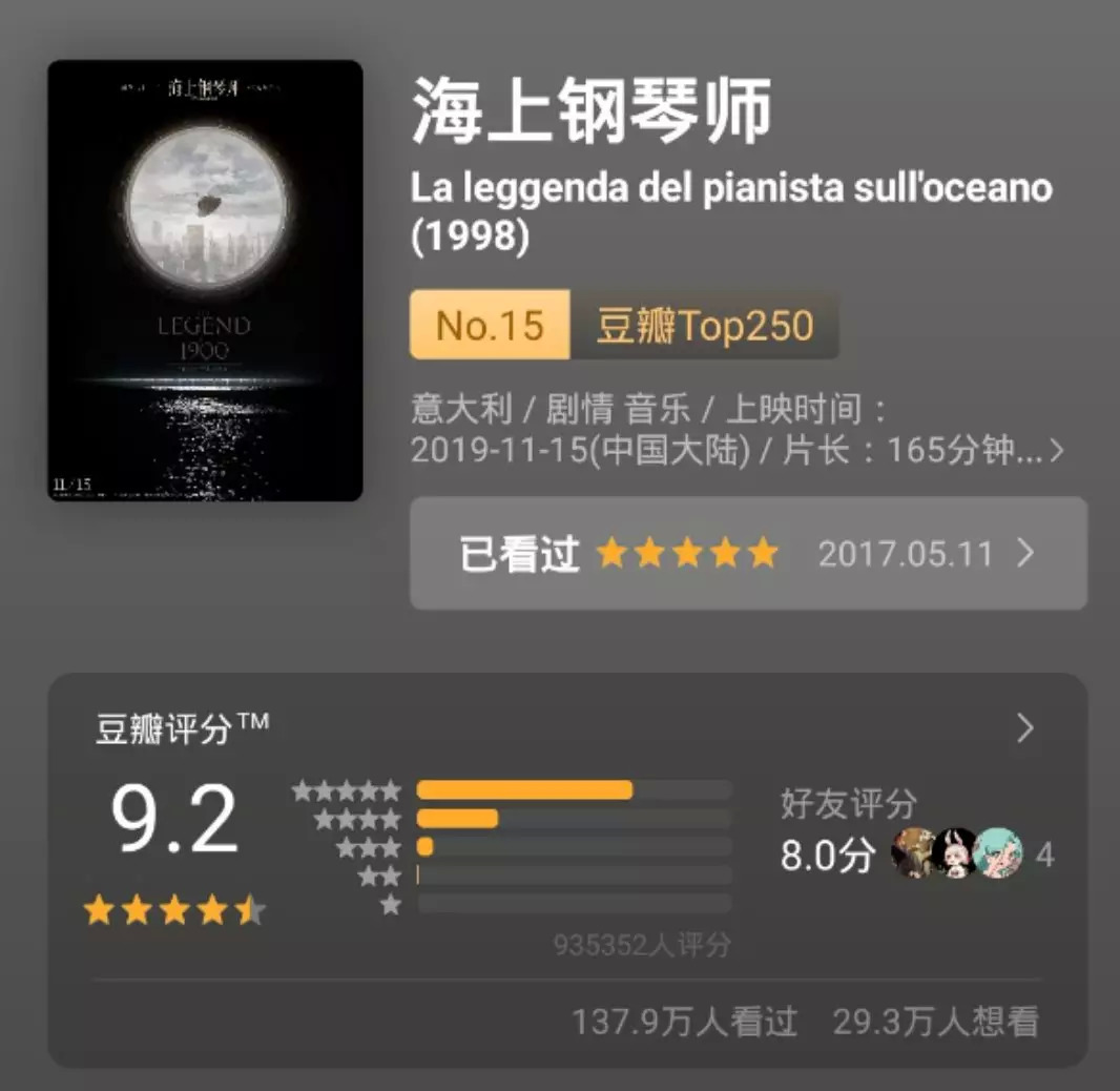 不得不说,海秀在拥有众多影片版权的片库中最终决定让《海上钢琴师》进入院线,在高昂的成本投入面前,其实并非是一个十拿九稳的选择。而且,相较于其它观众并不熟知的影片,豆瓣上标记已有138万人看过的《海上钢琴师》,它的市场表现充满更多的未知和不确定性。王海懿对此也承认这是一次冒险的选择。
