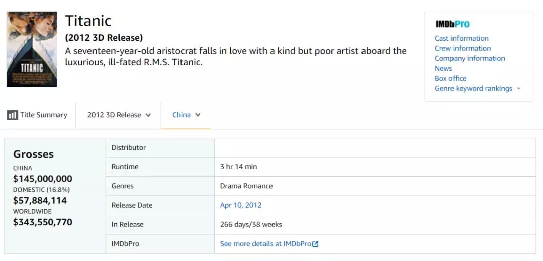 1998年,《泰坦尼克号》以3.6亿元的票房成绩,创造了中国电影市场票房纪录,并保持了11年。2012年,《泰坦尼克号》3D修复版上映,魅力不减当年,最终在中国揽获9.46亿元票房。