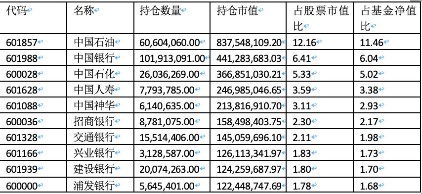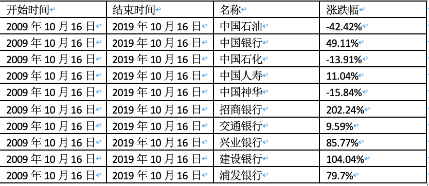 以上是上证综指2009年的前十名的重仓股,不难看出,中国石油占比12%,中国银行6.4%,中国石化5.33%,中国人寿3.59%,一只股票占到如此之大的权重,它的价格起伏势必对指数产生莫大的影响。那么,这些股票在去年十年的表现又是怎样的呢?