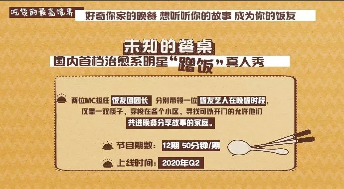 东方卫视的《亲爱的,来吃饭》虽未公布具体节目模式,但从海报看,很大程度上与《未知的餐桌》一样主打“蹭饭”。