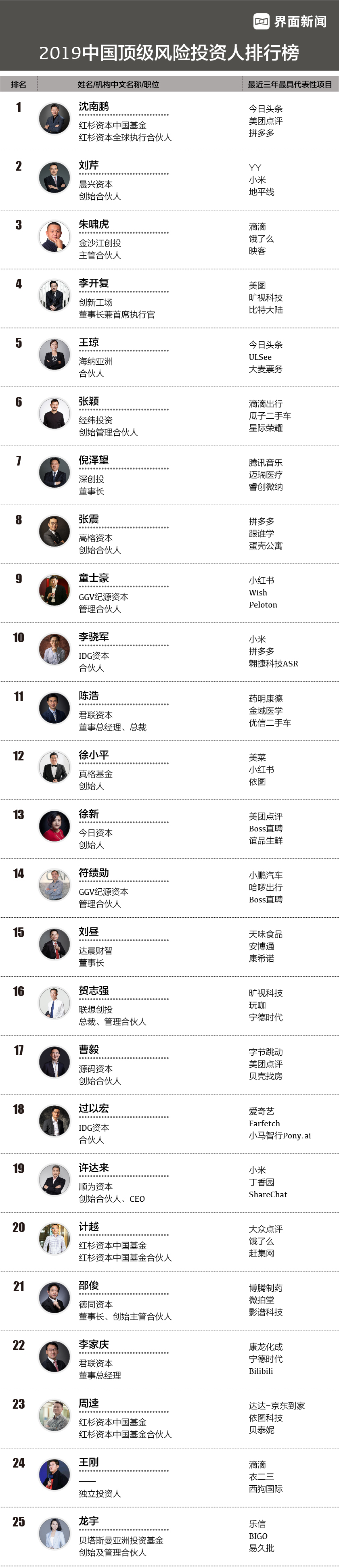 2019年11月19日,界面新闻第三次推出“中国顶级风险投资人”榜单。我们主要考察主流/活跃风险投资人过去三年的新投及退出项目。根据其业绩,及其在该投资项目中的参与度和贡献,评选出50位年度顶级风险投资人。