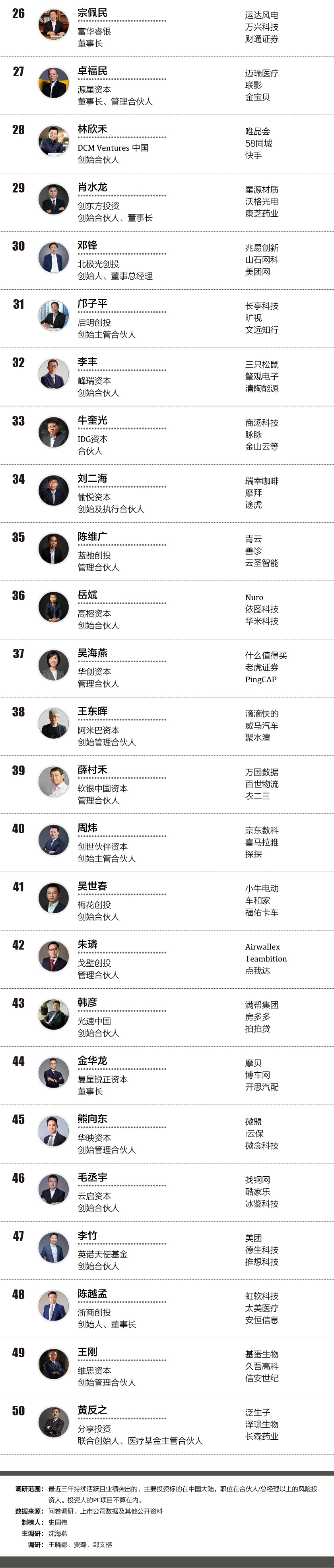 排名上升很快的还有IDG资本的合伙人李骁军(第10名),李骁军加入IDG资本已15个年头。李骁军主要关注市场足够大、发展足够快、创业家具有很强执行力、在行业内具有重要话语权的公司。小米、拼多多、哔哩哔哩、流利说、平安好医生、小牛电动这些他投资的优秀企业均于2018年上市,而他投资的三只松鼠也于2019年7月在深交所成功上市,取得了超百倍的投资回报。李骁军认为未来在科技和消费方向上,有很大的投资机会和发展空间。