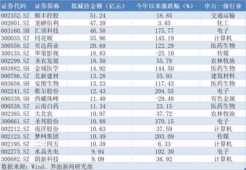 从减持金额来看,顺丰控股(002352.SZ)、龙蟒百利(002601.SZ)、汇顶科技(603160.SH)三家公司拟减持市值最大,分别高达51.24亿元、47.39亿元、46.58亿元。此外,还有同花顺(300033.SZ)、贝达药业(300558.SZ)、华策影视(300133.SZ)等15家公司拟减持金额超10亿元。
