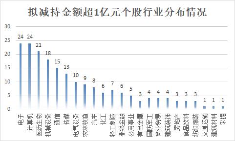 496家发布减持公告的公司中,拟减持金额超1亿元的共有197家,分布于24个申万一级行业当中。隶属于电子、计算机、医药生物板块的减持个股数量最多,分别达24只、24只、21只,而采掘、建筑材料、交通运输等板块减持个股数量较少,均只有1只。