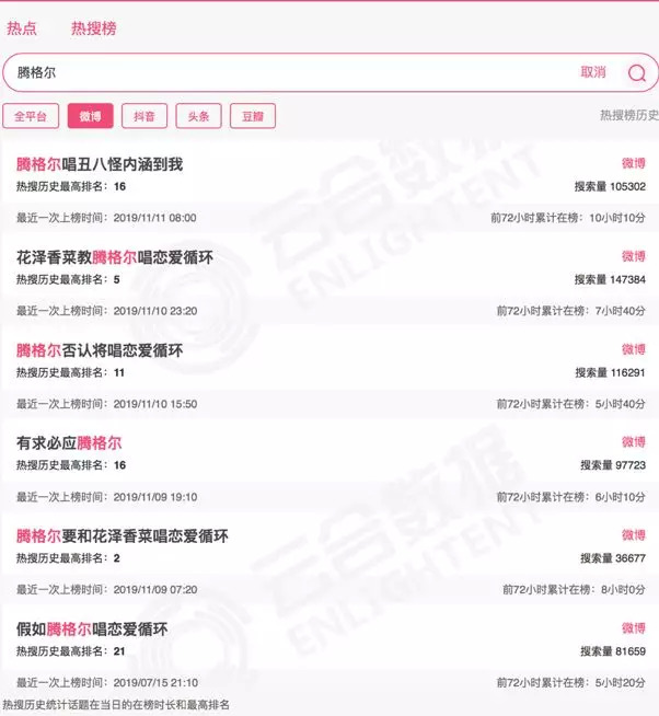《恋爱循环》梗是过不去了。11月8日“猫晚”流出一则假节目单,其中腾格尔的曲目恰好是两首:独唱《野狼Disco》,然后与花泽香菜合唱《恋爱循环》,这一爆炸消息冲上热搜第二位,腾格尔也发了一则微博表达自己对这一传闻的震惊,按理说算是辟谣,但反而让群众呼声更高涨了,网友觉得腾格尔一定会遂了观众的心愿,词条“有求必应腾格尔”登上热搜。