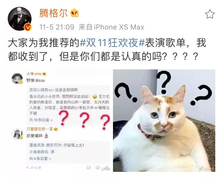 从此让腾格尔本尊唱一次《恋爱循环》成了不少网友的执念。“猫晚”宣布腾格尔将出席后,网友们给腾格尔留言点歌,时下大火的神曲《野狼Disco》和 《恋爱循环》占据了热评第一和第二。11月5日,腾格尔本人发微博回应道:“大家为我推荐的双11狂欢夜表演歌单,我都收到了,但是你们都是认真的吗????”