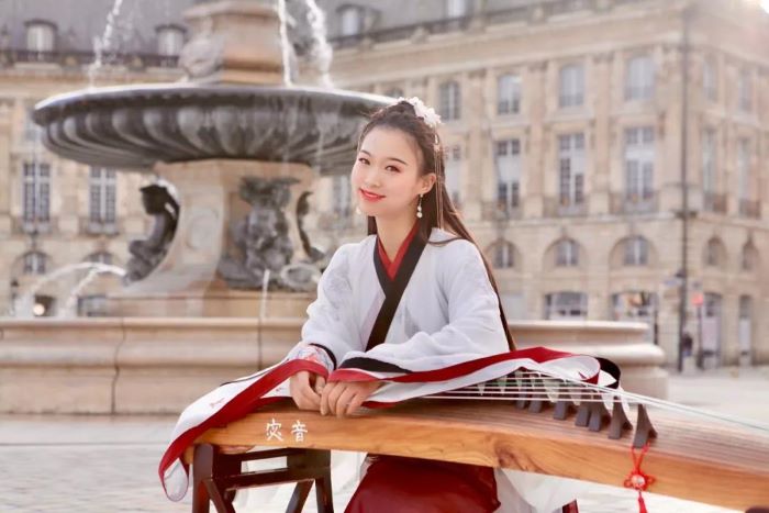 路人纷纷停下了脚步,向声源处汇聚。只见一个东方姑娘,广袖罗裙、眉目如画。一头青丝绾起一半,五指纷飞,奏出一首首古筝曲子,余音缭绕。