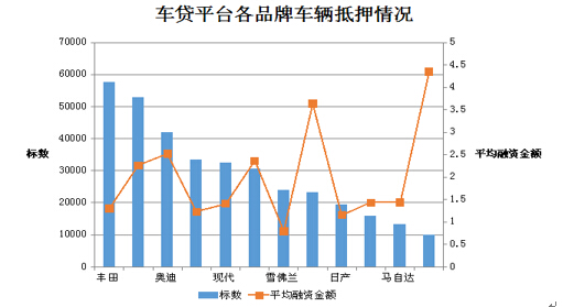 报告还选取了2015年以来,上述10家成交信息较为详细的平台,得到62万个P2P车贷案例。可以发现,前十大车辆抵押品牌被德系(4个)、日韩系(4个)和美系(2个)瓜分,国际大厂的汽车更受到P2P车贷抵押市场的青睐。其中,日系的丰田和德系的宝马是P2P车贷平台上被用来抵押最多的两种汽车品牌。前十大品牌汽车多数平均融资金额介入1-5万元之间。当然,也有部分顶级品牌如法拉利、古思特、欧陆、总裁的汽车价格昂贵,相应融资金额较高,平均融资金额在50万元以上。