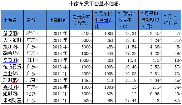 报告显示,这10家平台累计成交量占301家平台总成交量的近七成(27.1亿元),7月301家网贷平台的车贷成交量40.9亿元。