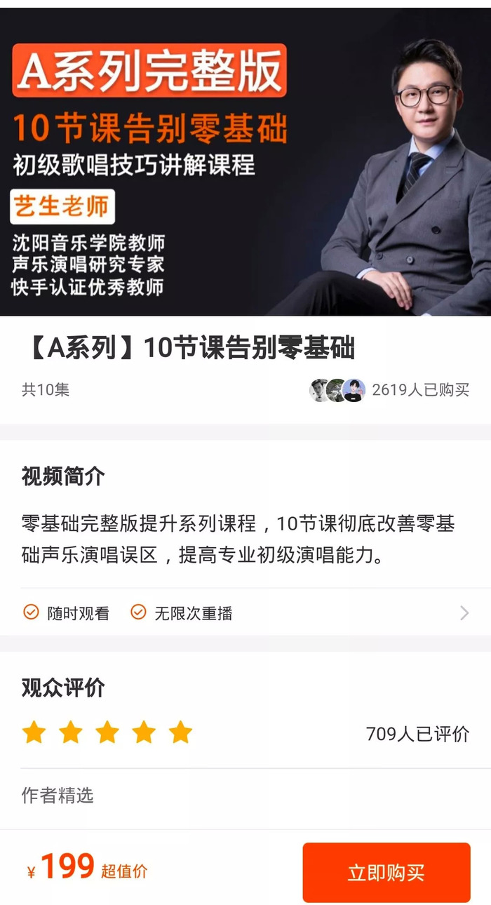 同样,艺生欧巴在快手上走红之后,也在思考着在布道之外的商业可能性,为此他持续改进自己的课程。他还邀请了自己的同事们加入艺生团队,一起入驻快手教育,他希望将沈阳音乐学院的招牌在快手打响。