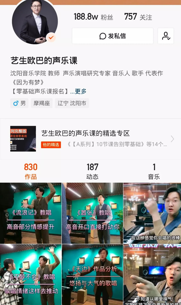 “大家好,我是艺生老师。”快手用户“艺生欧巴的声乐课”在短视频开头总喜欢这么介绍自己,因为他真的是个老师。在现实生活中,艺生欧巴是沈阳音乐学院的教师,主攻流行声乐。