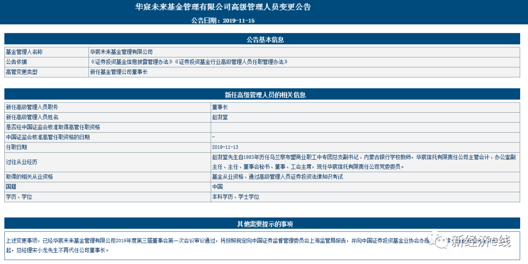 而且,华宸未来基金高管团队也一直处于动荡之中。仅以董事长一职为例,自2014年至今就先后经历了刘晓兵、向旭平、于建琳三任,其中向旭平任职仅5个月就因“任期届满”离职。如今,等到赵澍堂已是第四任了。